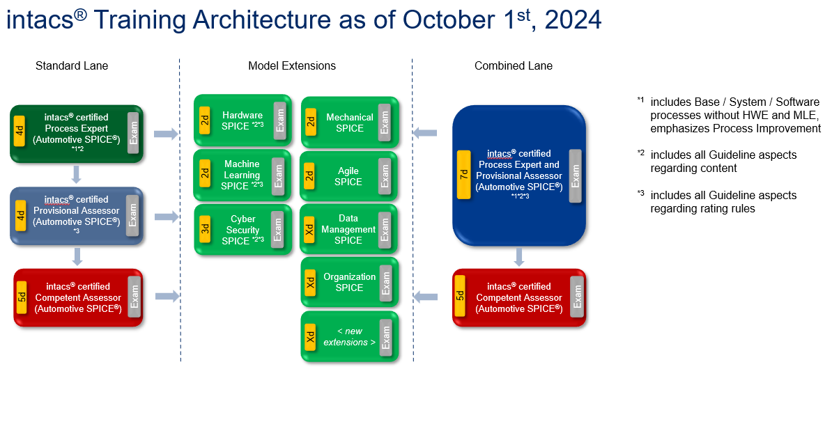 Automotive SPICE V4.0のリリースに伴い、intacs®認定トレーニングの仕組みと認定資格取得条件が2024年10月より変更されました。その背景には、メカ、電気電子系ハードウェア、そしてサイバーセキュリティに関する新たなプロセスアセスメントモデルの発行により、Automotive SPICEのアセスメントのより高い専門性が求められていることがあります。